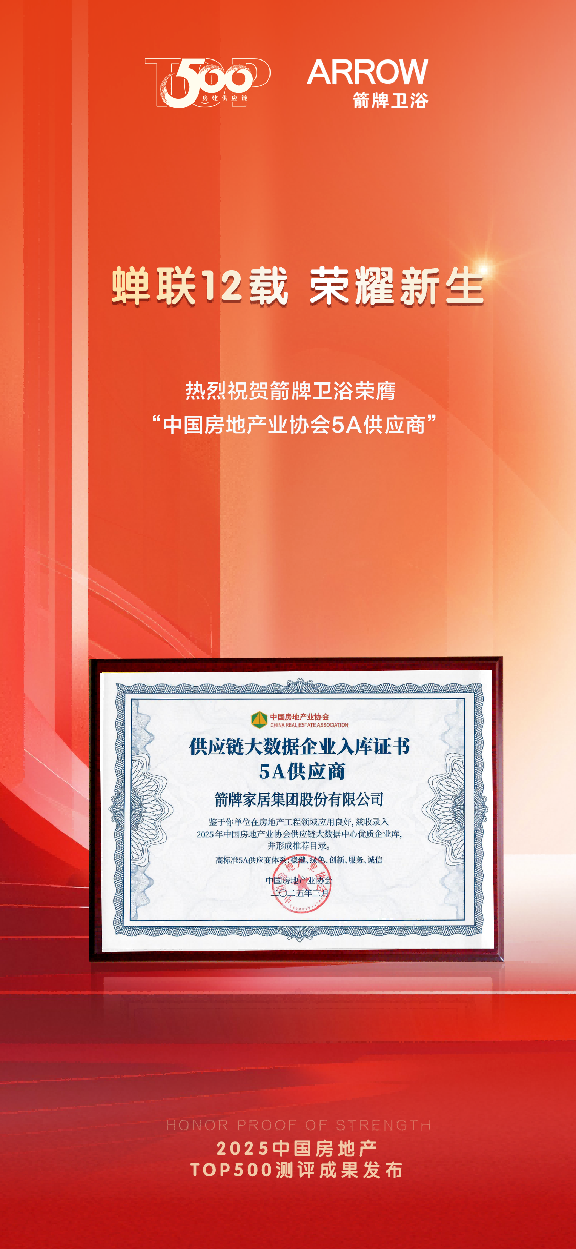箭牌卫浴凭借领先的房建工程实力、品牌力、强大的生产线、优质的产品以及领先服务意识,已连续12年蝉联房建供应链综合实力TOP500卫浴洁具类、淋浴房类、智能便盖类三项首选供应商!同时收录入中国房地产业协会供应链大数据中心并高标准“5A供应商”企业库(5A即生产力、产品力、服务力、交付力、创新力)。