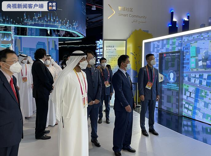 迪拜世博会中国政府总代表、中国贸促会副会长张慎峰(前排右二);中国驻阿联酋大使倪坚(前排左一);迪拜2020年世博会高级委员会主席谢赫·艾哈迈德·本·赛义德·阿勒马克图姆(前排左二)(图片来源:央视新闻客户端)